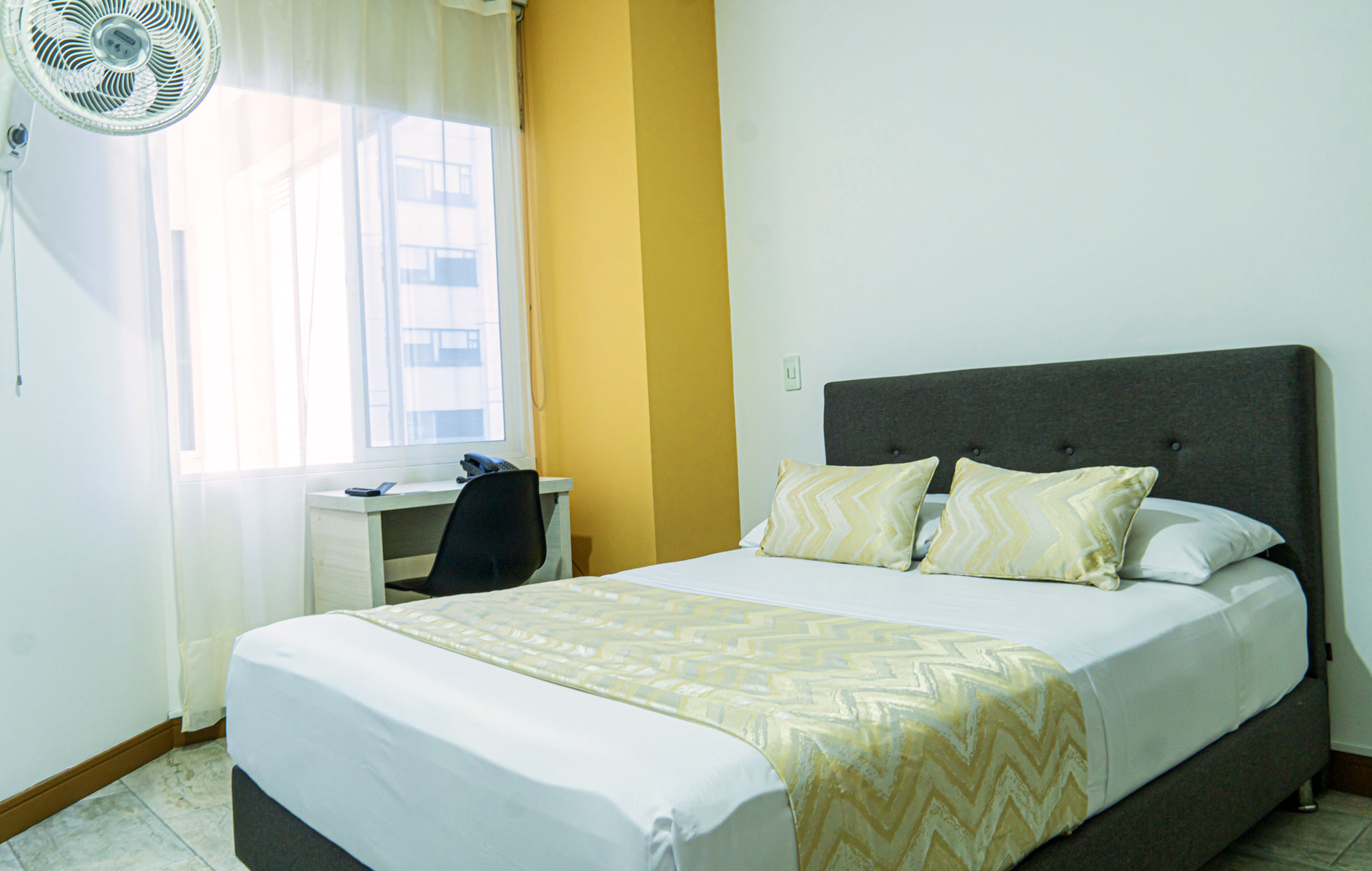 Habitación de hotel económica en Pereira con ventana, perfecta para quienes viajan por el eje cafetero solos o buscan privacidad. Ubicado en el centro de la ciudad. Nuestro Hotel en Pereira cuenta con TV, Wi-Fi, ventilador o aire acondicionado (según disponibilidad), y zona de trabajo con escritorio y silla para una estadía cómoda y productiva. Consulta y reserva fácil por Whastapp al mejor precio.